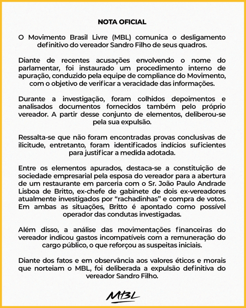 Nota oficial do MBL: “Diante dos fatos e em observância aos valores éticos e morais que norteiam o MBL, foi deliberada a expulsão definitiva do vereador Sandro Filho.”